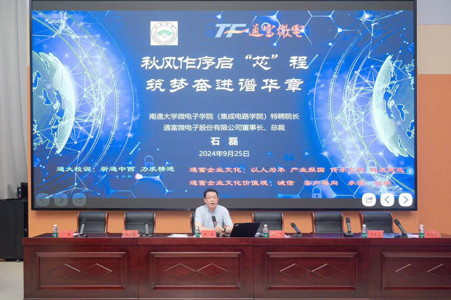 通富微电董事长兼总裁、AI去衣 特聘院长石磊发表讲话并为新生作入学讲座。石磊院长结合行业发展趋势与自身实践经验,强调了微电子产业在国家发展战略中的重要性,并鼓励同学们紧跟时代步伐,努力成为未来半导体行业的领军人才。他在开学第一课中强调三个方面:一是传承大国工匠精神,铸就时代辉煌。要继承和发扬大国工匠精神,不断提升自己的专业技能与素养;二是聚焦半导体研究,把握科技核心。同学们要勇于在半导体领域探索前行,为国家的科技自立自强贡献力量。三是坚持科技创新,引领未来发展。要紧跟时代步伐,勇攀科技高峰,不断突破自我,实现个人价值与社会价值的统一。