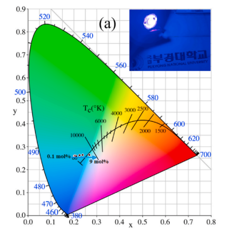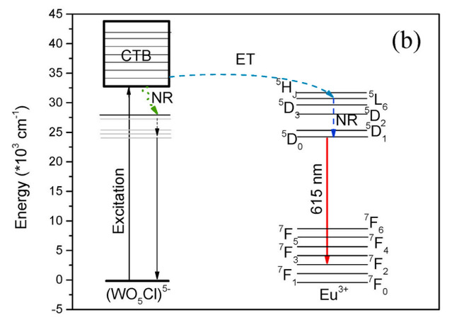 传统的白光LED通常采用多基质材料组合,尽管其在某些应用中表现良好,但面临色彩不一致、生产复杂性高和能效较低等问题。因此,研究单基质白色发光材料应运而生。文章的主要创新点在于:1,自激发发光特性:在近紫外光的激发下,Ca3WO5Cl2展示出来自[WO5Cl]5-基团的电荷转移发光,展现了优异的光学性能。随着温度从10 K升高至480 K,发光强度和寿命的降低体现了热淬灭现象,揭示了材料在不同环境条件下的适应性;2,Eu3+掺杂效果:掺Eu3+后,材料在红色发光区域(约615 nm)显现出典型的Eu3+的f-f跃迁,同时保留了宿主的蓝色发射(约450 nm)。能量转移机制的研究表明,[WO5Cl]5-基团与Eu3+之间的能量转移效率最高可达40%(在9.0 mol%时),为单一稳定宿主中的白光发光提供了可能性。该研究不仅拓展了钙钨酸盐材料的应用前景,也为未来光电子器件的开发提供了重要的理论基础。