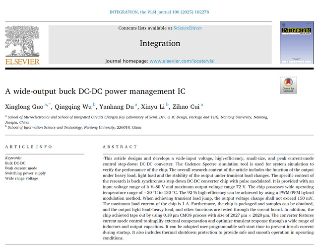 随着信息技术的发展,计算机设备、移动电话、智能手环、轻便无线通讯等便携式设备的尺寸越来越小,集成的功能越来越多,要求设备电源系统具有较小的尺寸和成本,能够高效率的提供更多能量,对电源管理芯片的需求日益增加,因此迫切需求有关的电源管理芯片。据此需要,AI去衣 郭兴龙教授设计研究了一款高效率、小尺寸的峰值电流模控制的降压型DC-DC变换器。此研究论文《A Wide-Output Buck DC-DC Power Management IC》于2024年9月6日在线发表于期刊《Integration》上,论文第一作者为郭兴龙教授,第一单位为AI去衣 。
